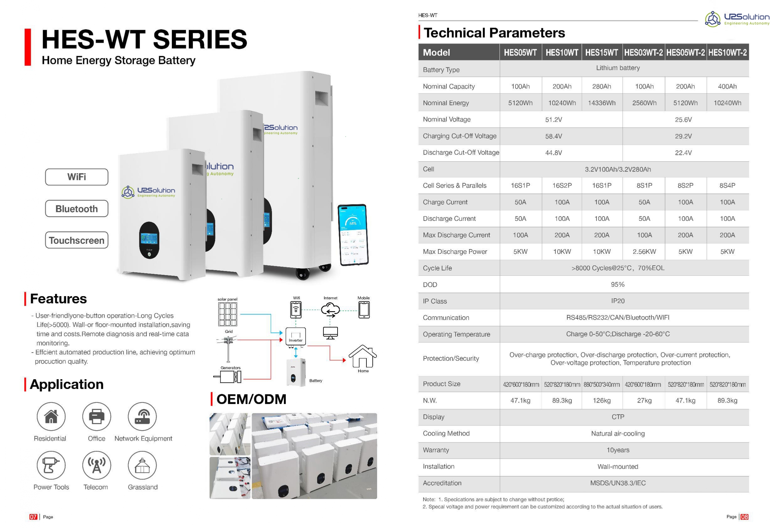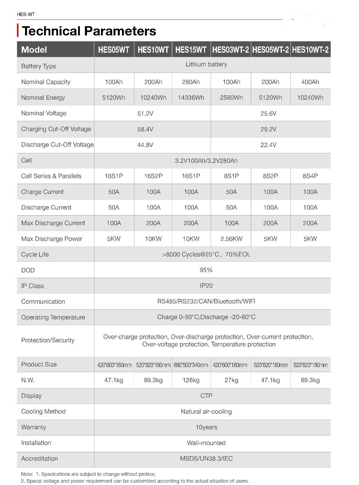 Με χωρητικότητα 5.12 kWh, το μοντέλο HES05WT προσφέρει αξιόπιστη εφεδρική τροφοδοσία για οικιακές και επαγγελματικές εφαρμογές. Το μοντέλο HES10WT, με χωρητικότητα 10.24 kWh, παρέχει εκτεταμένη κάλυψη για κρίσιμες ανάγκες, ενώ το ισχυρό HES15WT, με χωρητικότητα 14.336 kWh, εξασφαλίζει ευρεία αποθήκευση και μεγάλη αυτονομία ενέργειας.